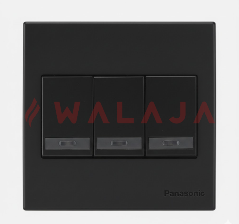 The Panasonic Wide Black 3-Gang 1-Way Single Pole (SP) Wide Switch is designed to control three separate lighting circuits from a single location. With a premium wide black finish and a 16AX rating, it ensures reliable performance for modern lighting systems, including LED loads, while enhancing interior aesthetics.